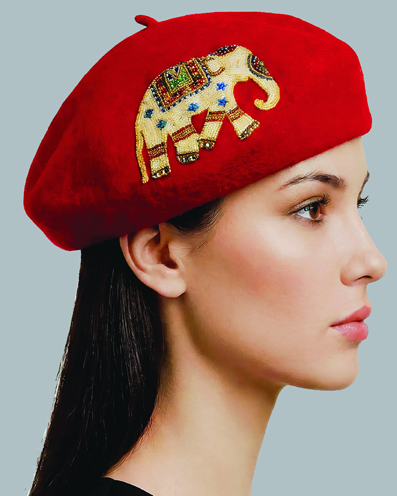 This piece reimagines the timeless French beret by infusing it with a touch of royal Eastern heritage. The centerpiece is an intricately embroidered elephant, adorned in ceremonial regalia, symbolizing wisdom, strength, and good fortune. Designed for the bold spirit, this beret transforms a simple accessory into a conversation starter. It is meant to be a statement piece that elevates a monochrome outfit (like the black top in the image) into an ensemble of artistic expression.