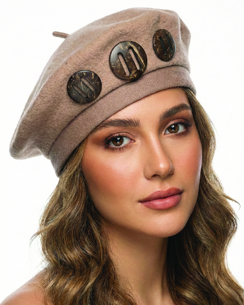 This beret is designed for the discerning individual who appreciates the timeless appeal of a classic felt beret but seeks a unique, modern twist. The concept blends traditional craftsmanship with bold, sculptural details. The three prominent, button-style accents serve as a contemporary focal point, transforming a staple accessory into a statement piece. The luxurious interior lining and patterned sweatband are a nod to hidden quality and personal style, ensuring the wearer feels as good as they look.