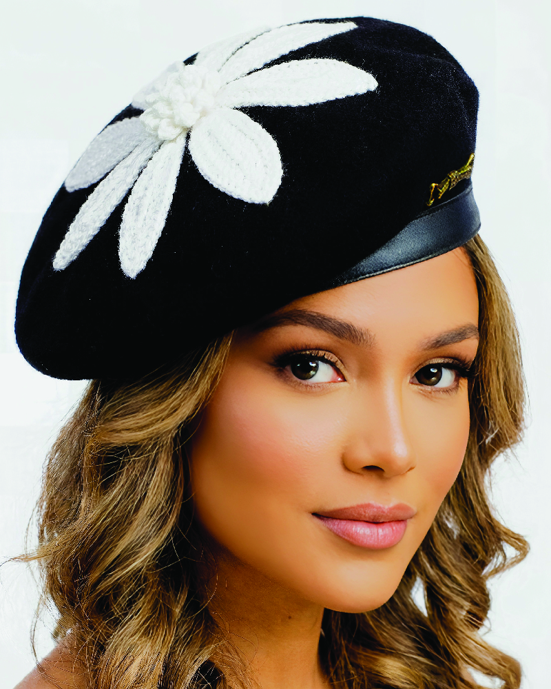 The Noir Marguerite is a statement piece that bridges the gap between classic millinery and contemporary art. It re-imagines the traditional military-style beret by softening the silhouette with a bold, oversized, hand-crafted floral motif. This beret is designed for the woman who views her accessories not just as accents, but as the centerpiece of her outfit. It balances the “toughness” of the structured black felt and leather band with the “softness” of the white floral crochet, creating a look that is both authoritative and feminine.